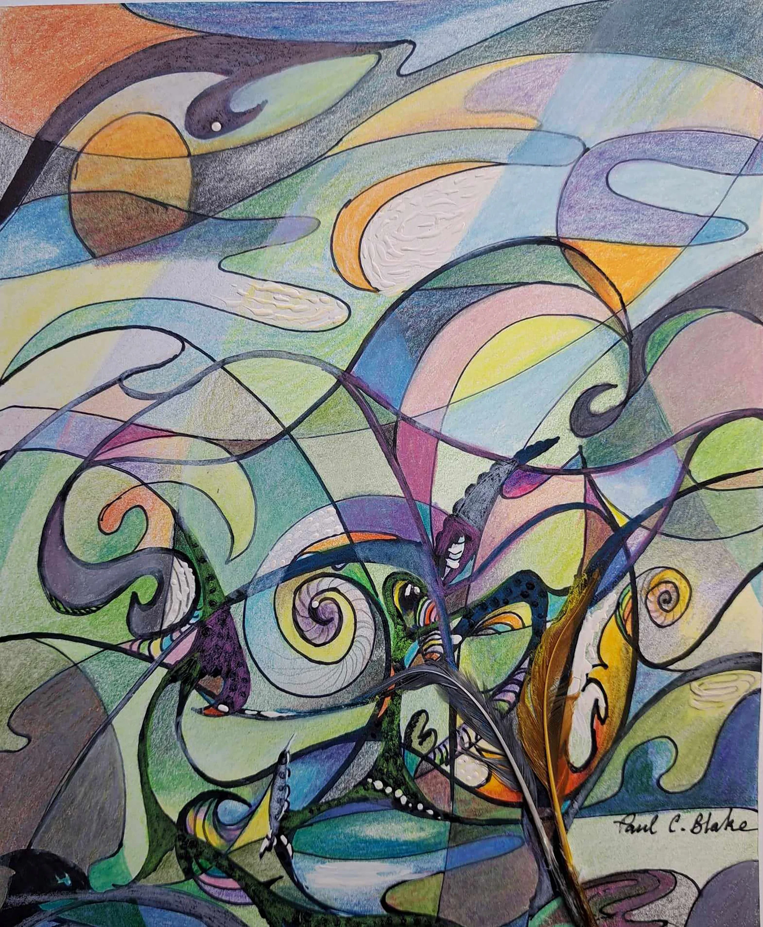 View fullsize Nature #1Color pencils, ink, acrylic paint, feathers, glue, & acetateDimensions: 14” x 11” Inquiries
