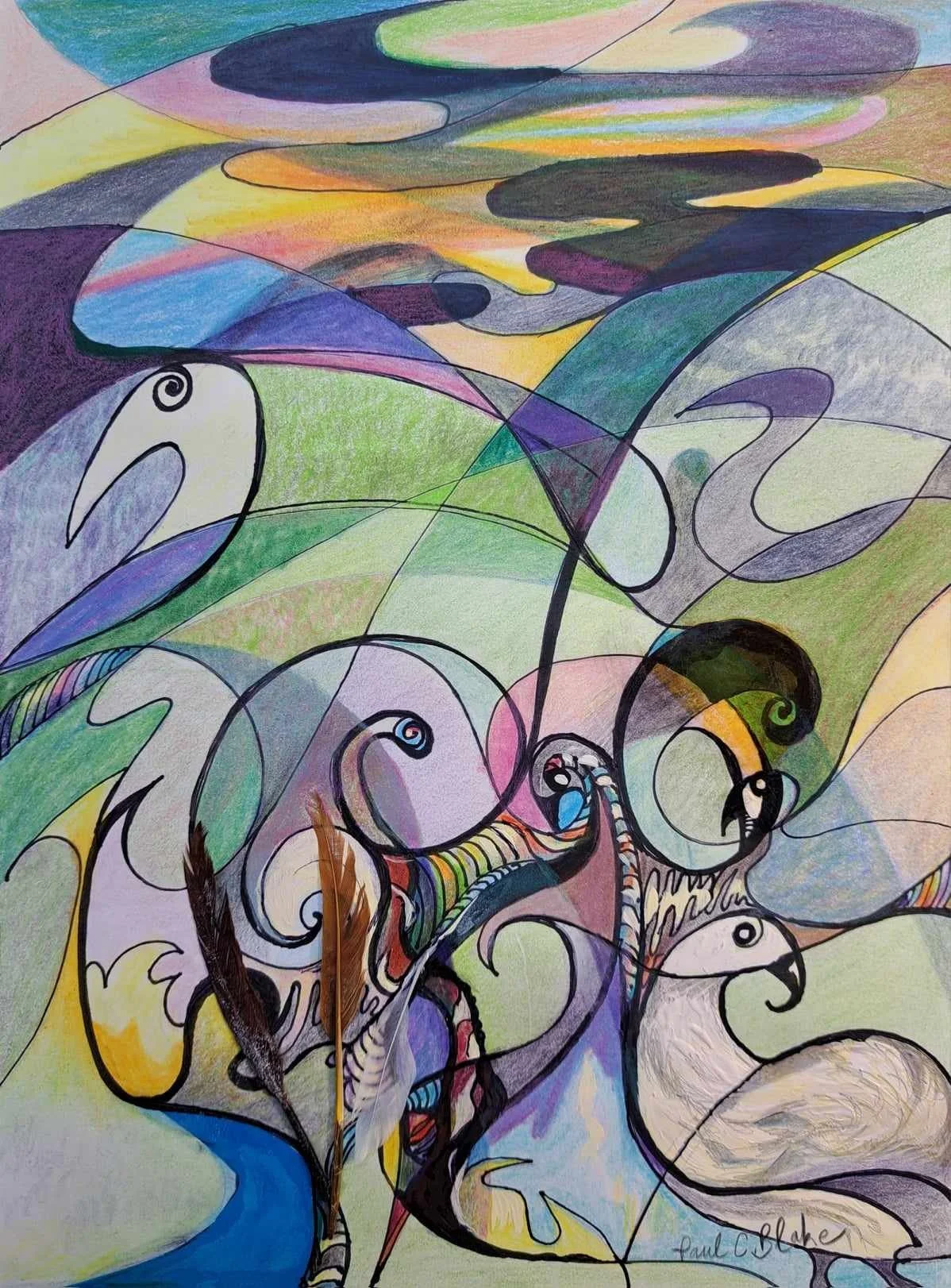 View fullsize Nature #11Color pencils, ink, acrylic paint, feathers, glue, & acetateDimensions: 20” x 16” Inquiries