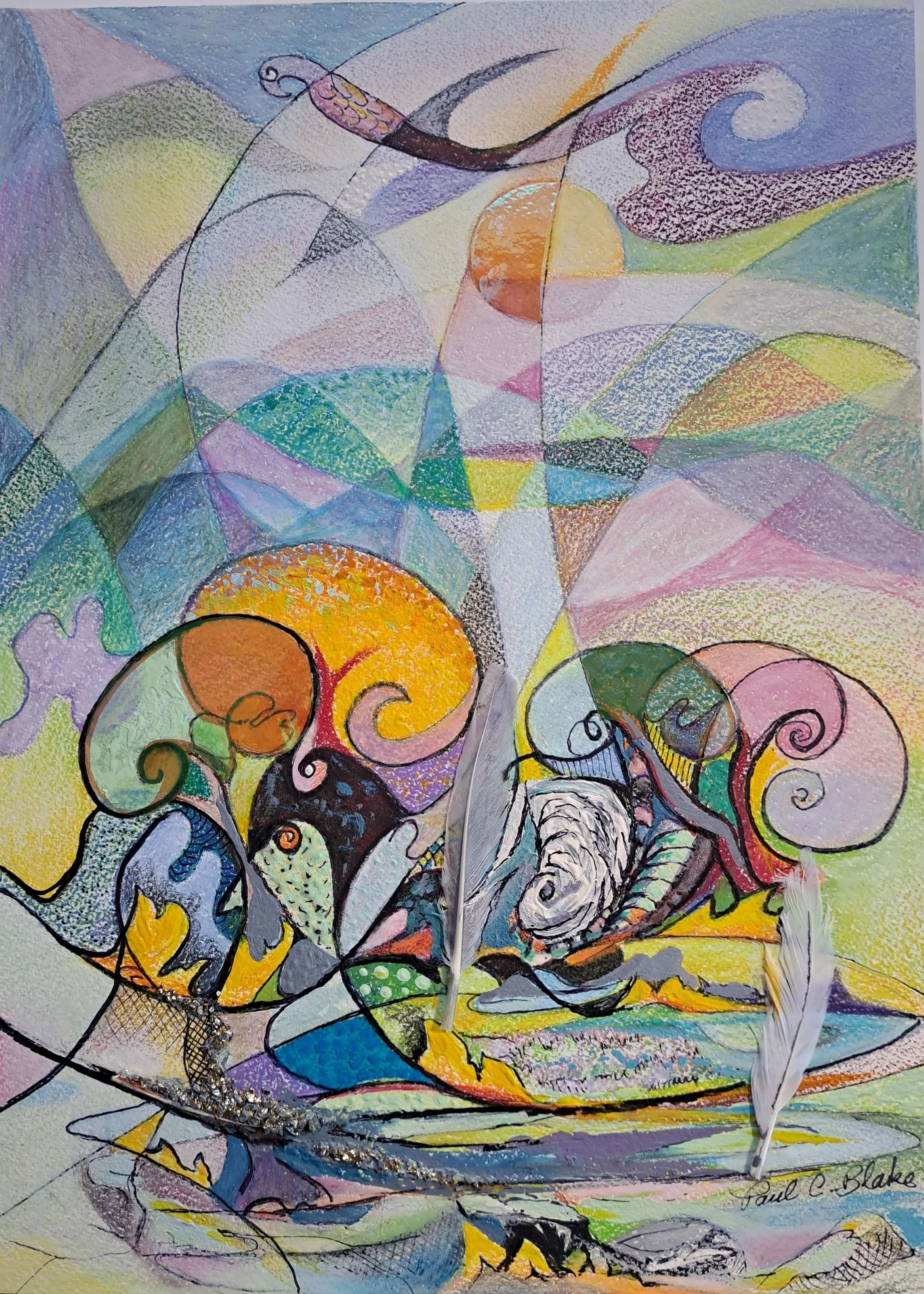 View fullsize Nature #19Color pencils, ink, acrylic paint, feathers, glue, gold flakes, & acetateDimensions: 20” x 16” Inquiries