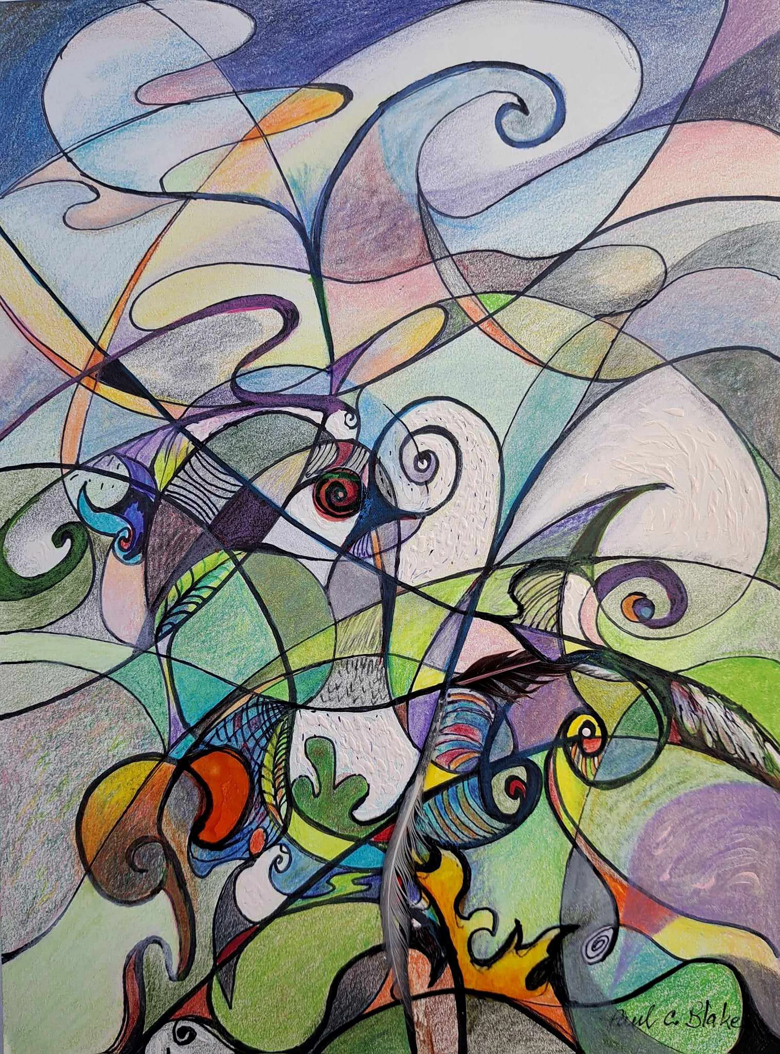 View fullsize Nature #3Color pencils, ink, acrylic paint, feathers, glue, & acetateDimensions: 20” x 16” Inquiries
