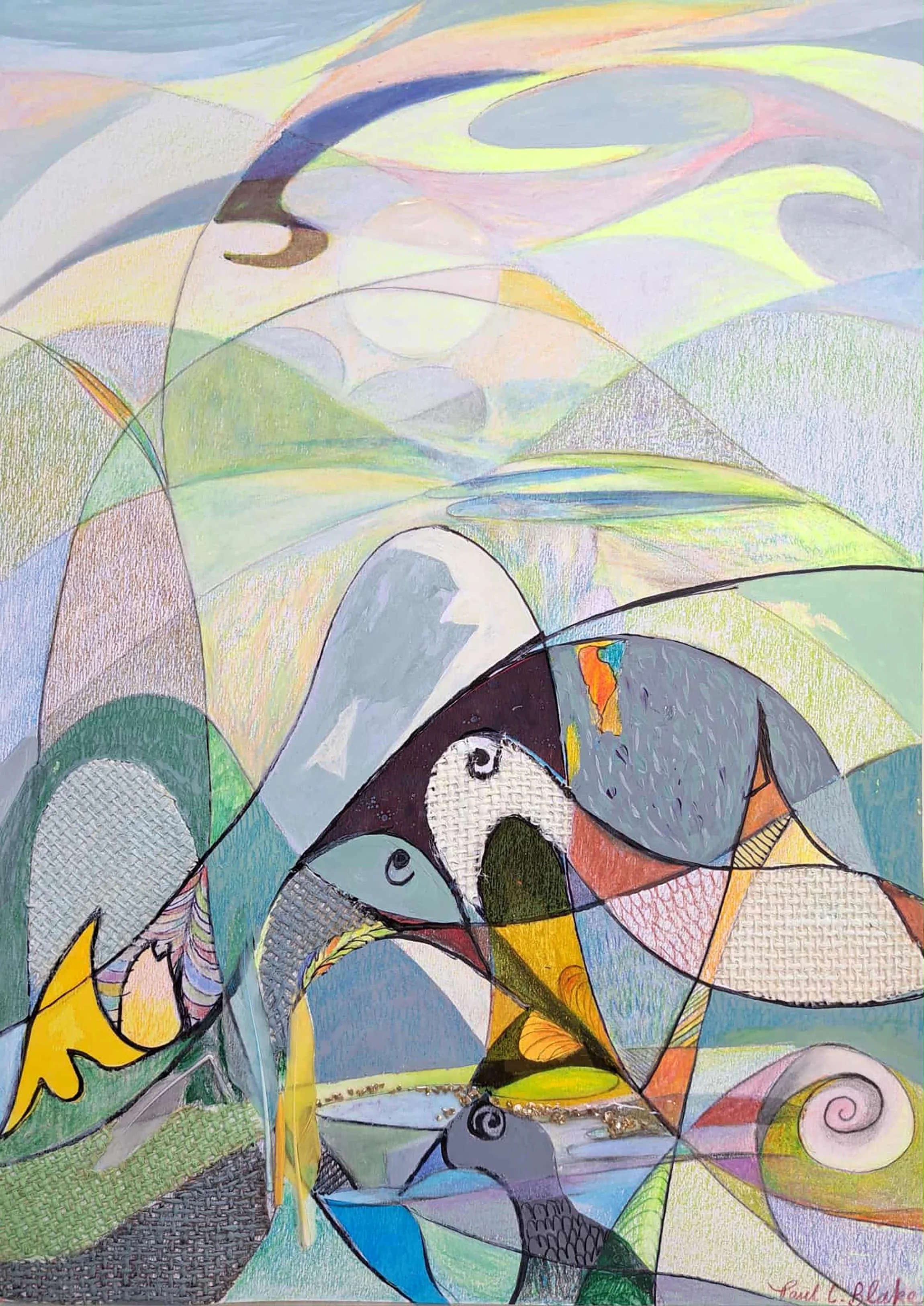 View fullsize End of Times (Nature #31)Color pencils, ink, acrylic paint, feathers, glue, burlap, gold flakes, & acetateDimensions: 20” x 16” Inquiries