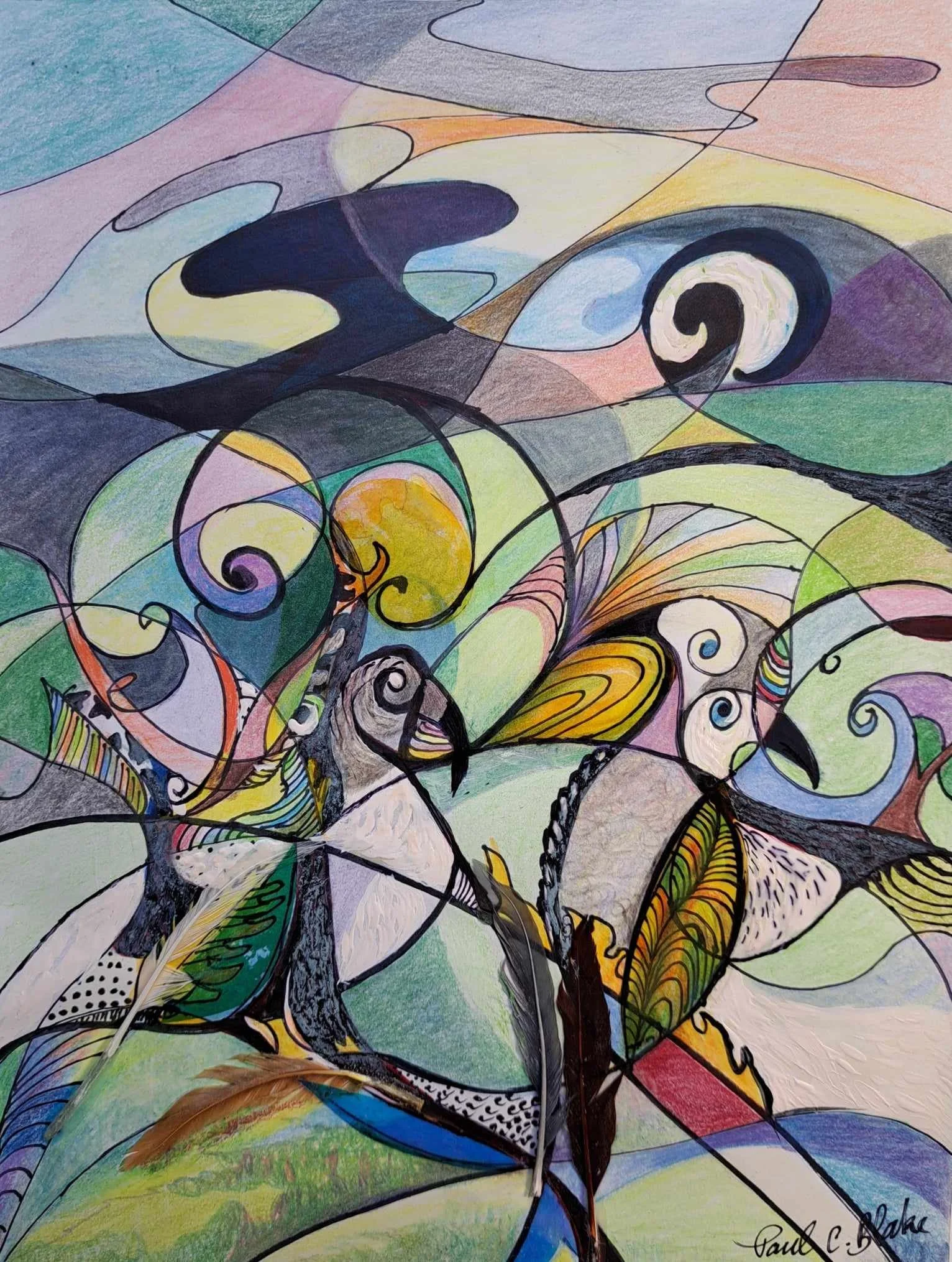 View fullsize Nature #9Color pencils, ink, acrylic paint, feathers, glue, & acetateDimensions: 20” x 16” Inquiries